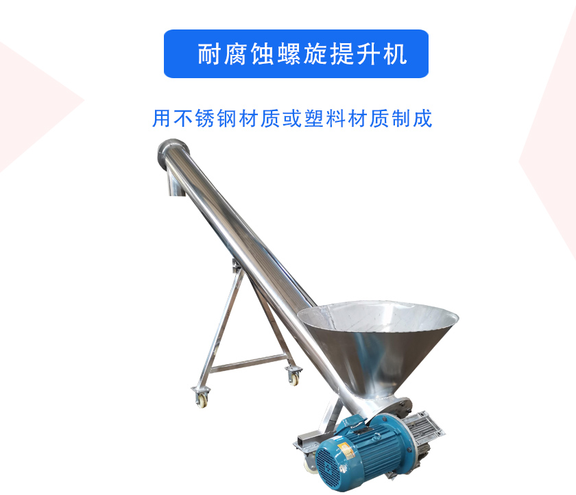 耐腐蚀螺旋提升机的材质和结构特性决定了该设备在输送物料时具有耐磨、不易被腐蚀、输送密闭、移动方便和输送量大等优点。